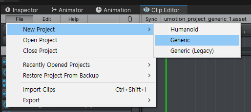 3) Clip Editor에서 [File > New Project > Generic]을 선택한다. Generic animation이 아닌 Humanoid animation을 사용하는 경우에는 Humanoid 옵션을 선택하면 된다.