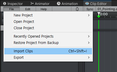 9) Clip Editor에서 [File > Import Clips]를 선택한다.